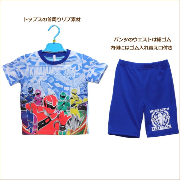 魔進戦隊キラメイジャーのキャラクターがプリントされた、暗闇で光る勇気リング付き半袖シャツと半ズボンの上下2点セット/ルームウェア♪